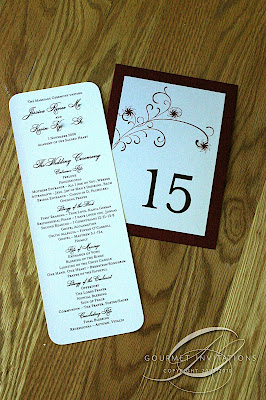 Jessica's Letterpress invitations, with her grandmother's brooch-inspired graphic, served an alternate purpose of being envirnomentally friendly. Since Kevin is an environmentalist, conserving on paper was very important to them. We continued that "green" philosophy on their extras as well. We did single panel table numbers and a narrow double-sided program. And one of the best "green" items is the seating chart. You don't waste all of the cardstock on placecards that are thrown away by the second course and it is a wonderful keepsake.