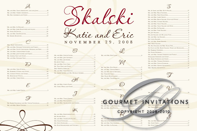 Katie's invitations incorporated a beautiful, rich color combination that complimented each other so nicely. For her reception, I continued the scheme on to her seating chart, unity candle, table numbers, thank you signs, and programs. Congratulations to you both!