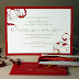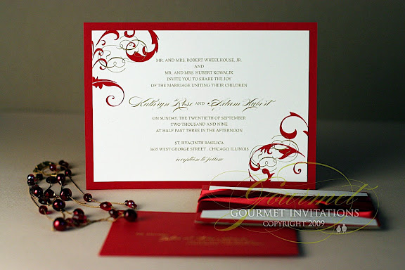 The inserts are wrapped with yards of luscious red ribbon and you can see the effect with the metallic gold ink on the rsvp card.