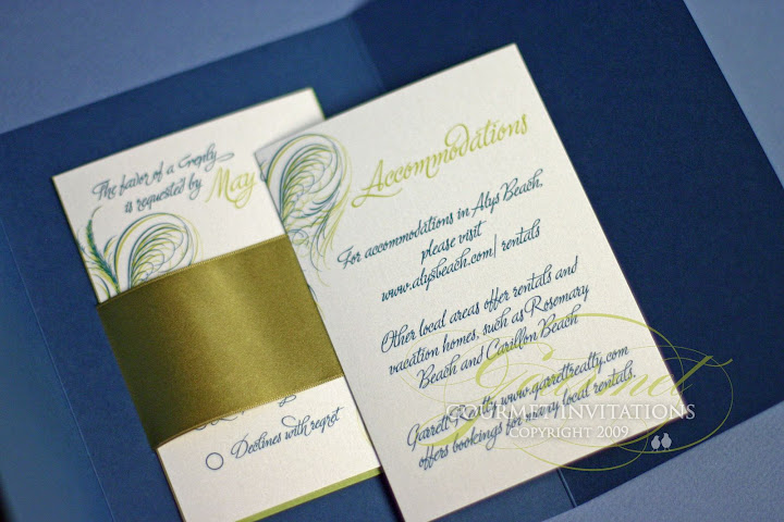The invitation was designed with a custom font with lots of swirls to mock the peacock feathers. The invitation is designed to come out of the gatefold with the inserts held inside with ribbon.