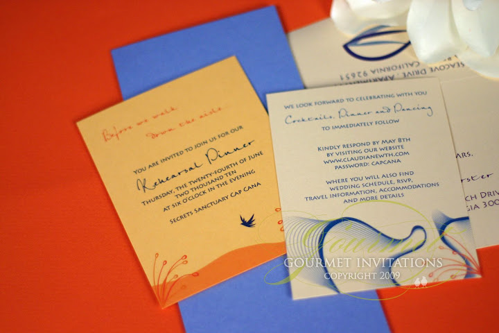 The inserts included a rehearsal dinner invitation with a beach scene and also a travel information card.