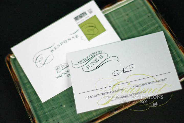 The RSVP postcard was designed with custom swirled stamps and a beautiful swirl design on the back.