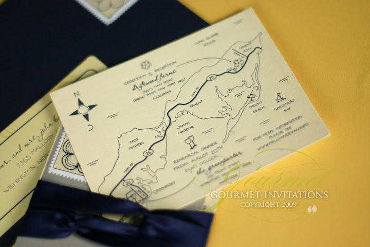 Custom maps were designed with all of the locations of events and hotels. They were printed in navy on yellow letterpress.