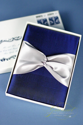 Monique contacted me after seeing my silk folio invitation in The Bride and Bloom magazine. She wanted something very similar. I designed these with a beautiful Navy silk folio that was mailed in a white box. I wrapped the invitation in yards of silver ribbon.