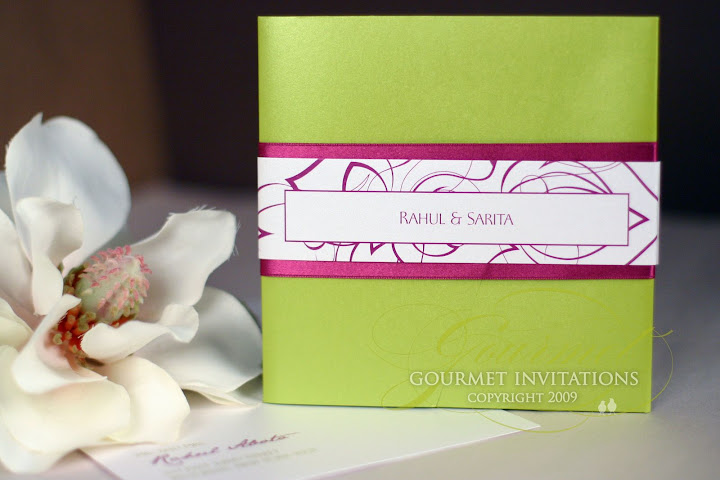 Mirna and Gian are my first couple from Southern Asia to ask me to design their invitations suite. They didn't want the typical Indian style invitations, but wanted something that reflected their culture, but with their New York style. Mirna suggested a large palm leaf for the motif and her amazing colors of magenta and green were perfect for this pocketfold suite.